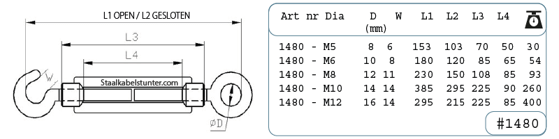 Wire tensioner hook and eye M12 DIN1480 For tensioning thicker steel cables