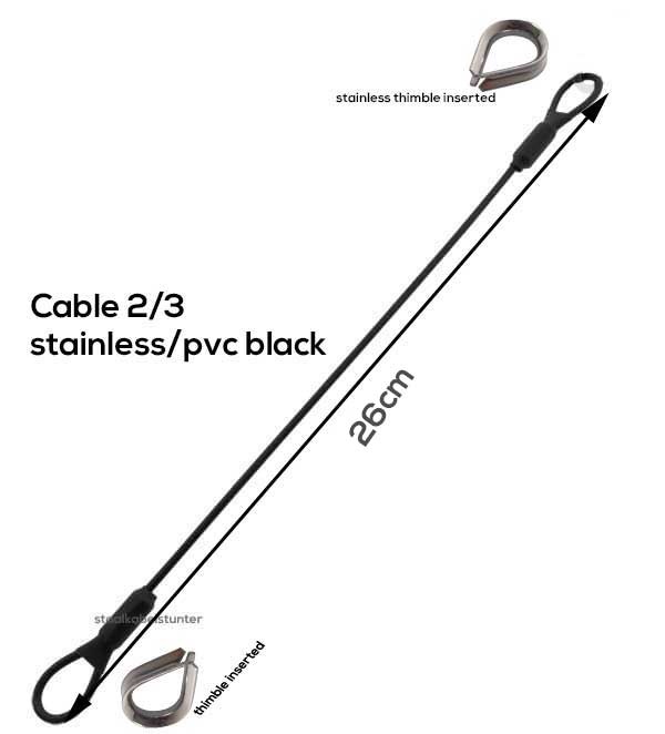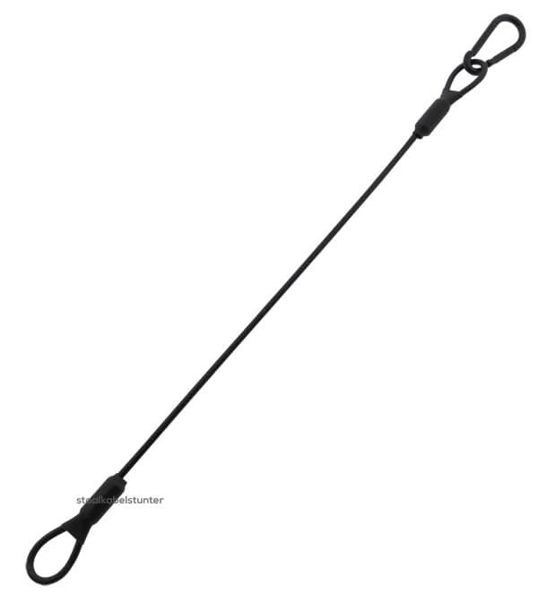 Flexible black plastic coated steel cable. Fitted with aluminium press clamps, which in turn are fitted with a black heatshrink tubing. The black carabiner can be clipped to any object of 5mm. These cables are also extremely suitable for the theatre and circus branch.