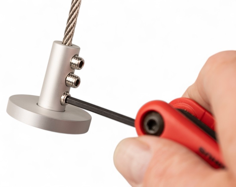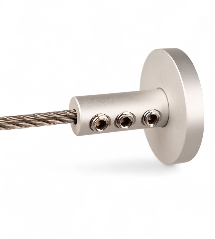 Aluminium Staalkabel wandhouder met 3 inbus bevestigingen. Geschikt voor 3 en 4 mm staalkabel. Met schroefbare afdekkap voor een strakke afwerking.