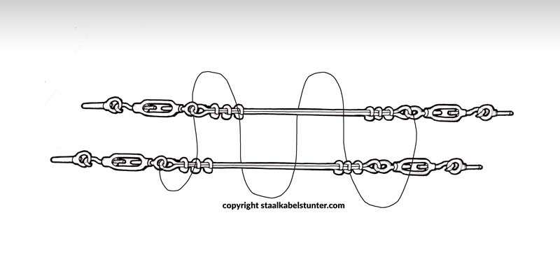 Het pakket bevat alle onderdelen om een lijn te maken die de straat oversteekt. De eerste staalkabel, van 4 mm dik verzinkt staal, span je over de straat (in twee delen), stevig in de muren verankert met de bijgeleverde keilbouten. Zodra deze draad goed strak staat kun je met de dunnere kabel (2 mm dik verzinkt staal) een zigzagpatroon aanbrengen, om de planten voldoende grip te geven.