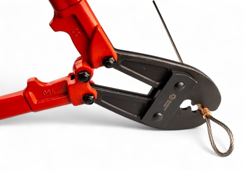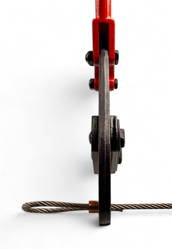 Kabelklemtang met rubber handgrepen voor het aanpersen van draadklemmen voor staalkabel met een diameter van 5 tot 8 mm.