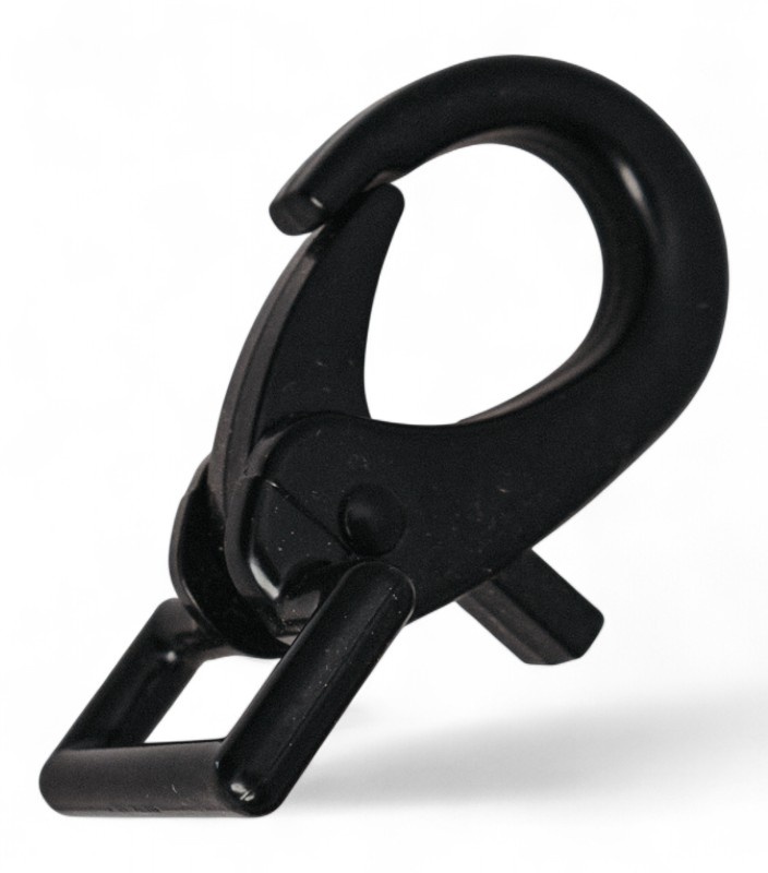 Zwarte Musketon clip rechthoekige wervel, met banddoorvoer van 22 en 25 mm - zeer geschikt voor riemen en spanbanden.
