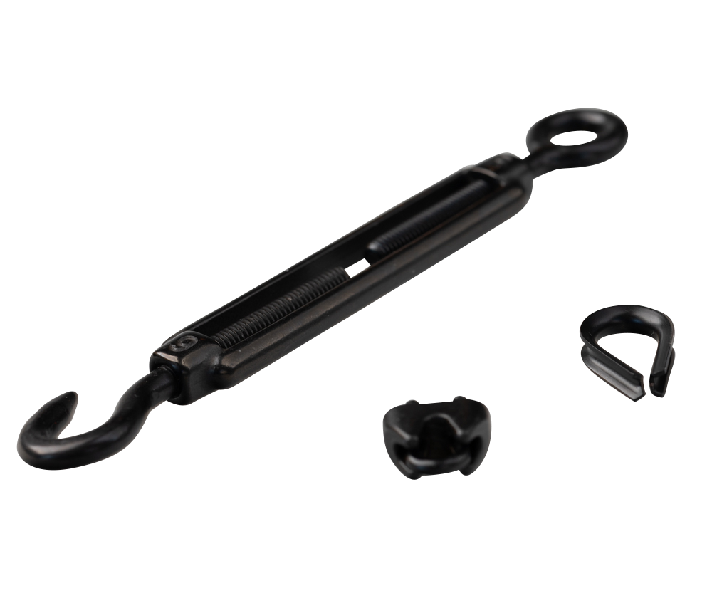 De Zwarte Draadspanner haak en oog RVS M6 is een duurzame en sterke draadspanner van RVS met een M6-schroefdraad. Ideaal voor het spannen van staalkabels, draad en touwen in diverse toepassingen, zoals hekwerken, tuinprojecten en bouwconstructies.