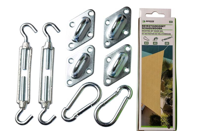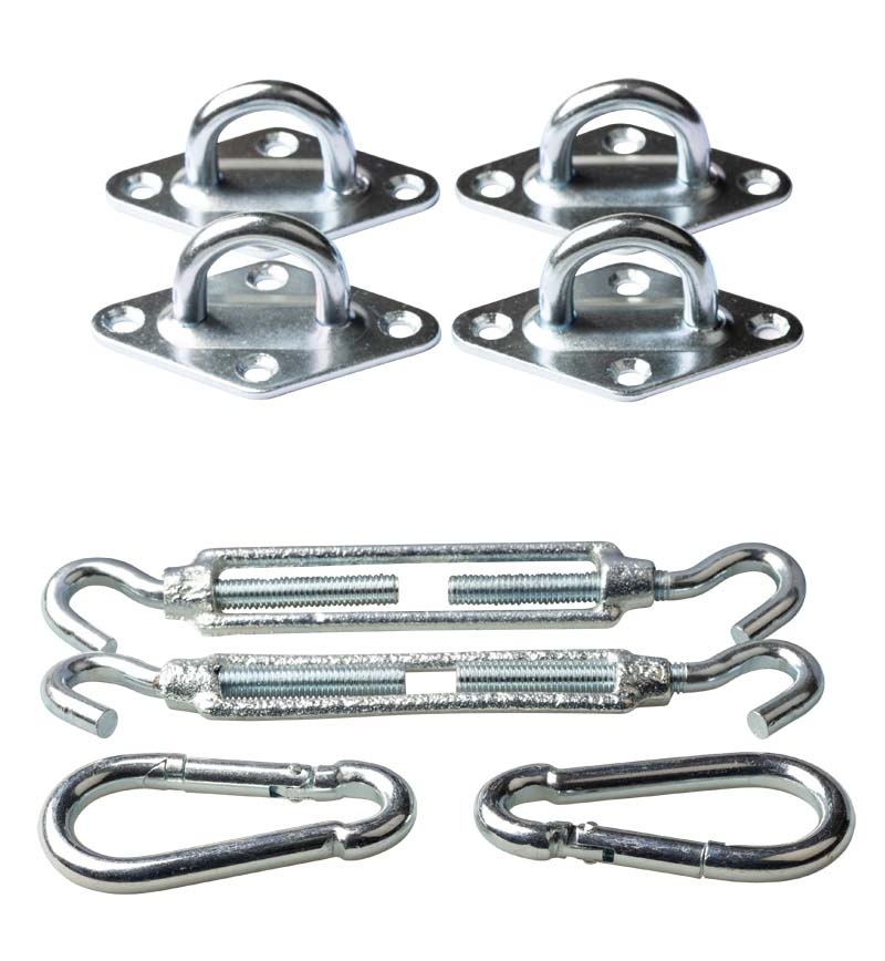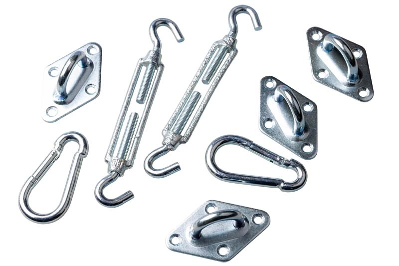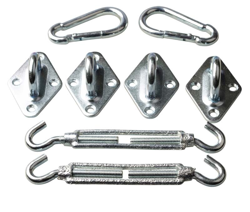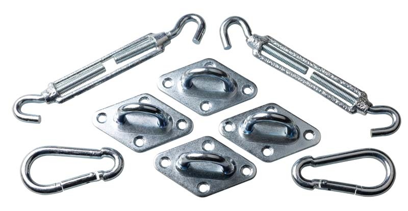 Universeel Schaduwdoek ophangpakket. Voor het eenvoudig bevestigen van je schaduwdoek of hangmat. Met deze complete set heb je gelijk alle benodigdheden in huis! verschillende soorten schaduwdoeken ophangen is nog nooit zo eenvoudig geweest!