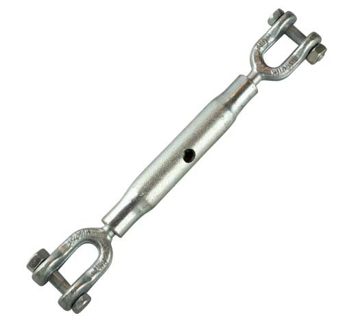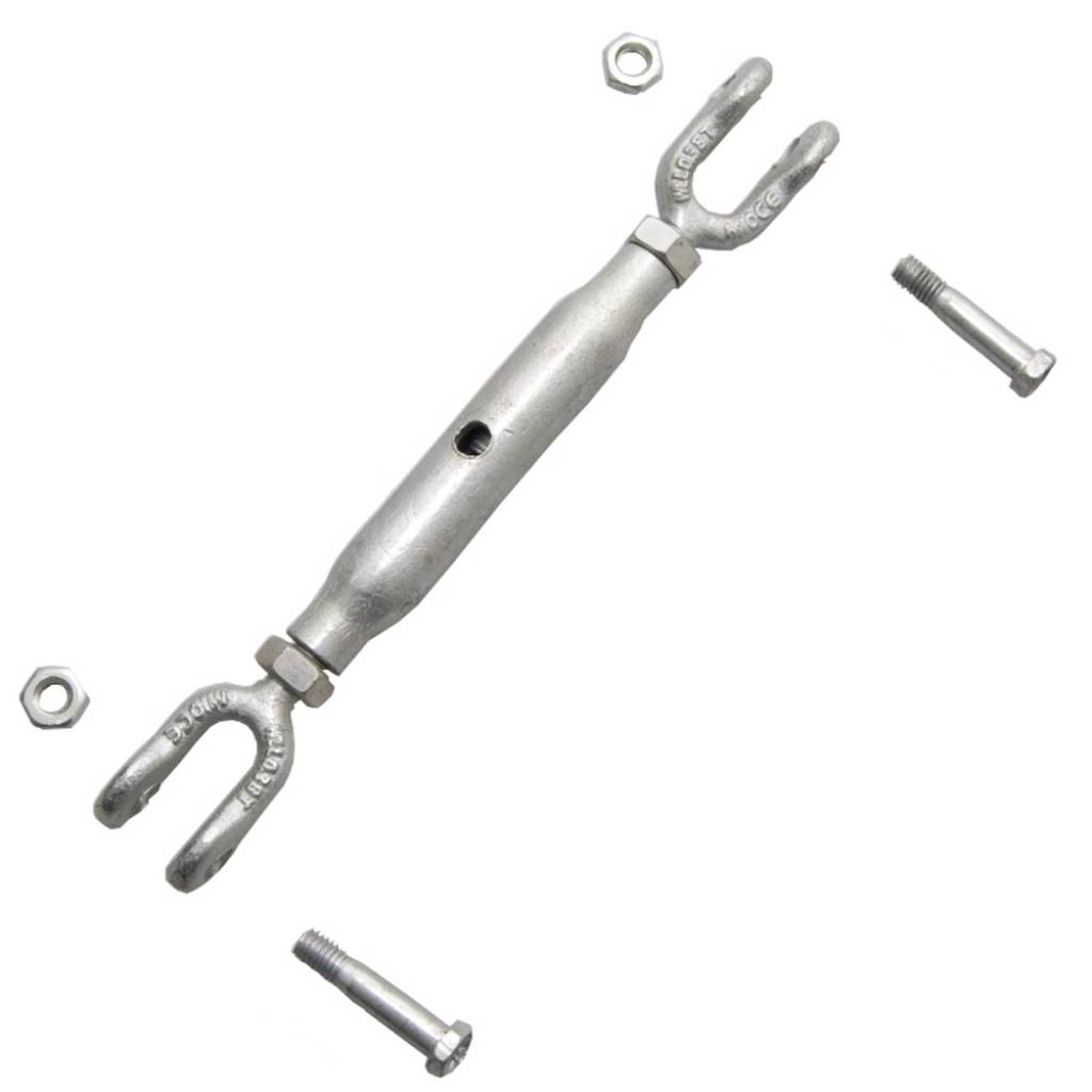 Draadspanner M12 DIN 1478 verzinkt met gaffel/gaffel aansluiting voor het krachtig spannen en afstellen van staalkabels. Geschikt voor zwaardere toepassingen zoals constructies en overkappingen. Verstelbaar en geschikt voor binnen- en buitengebruik.
