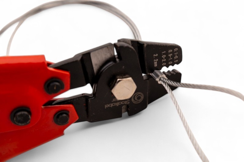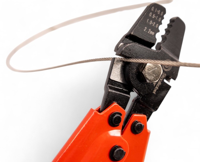 Staalkabelpakket met knijploodjes voor het maken van verschillende constructies. Met perstang en draadknipper in 1